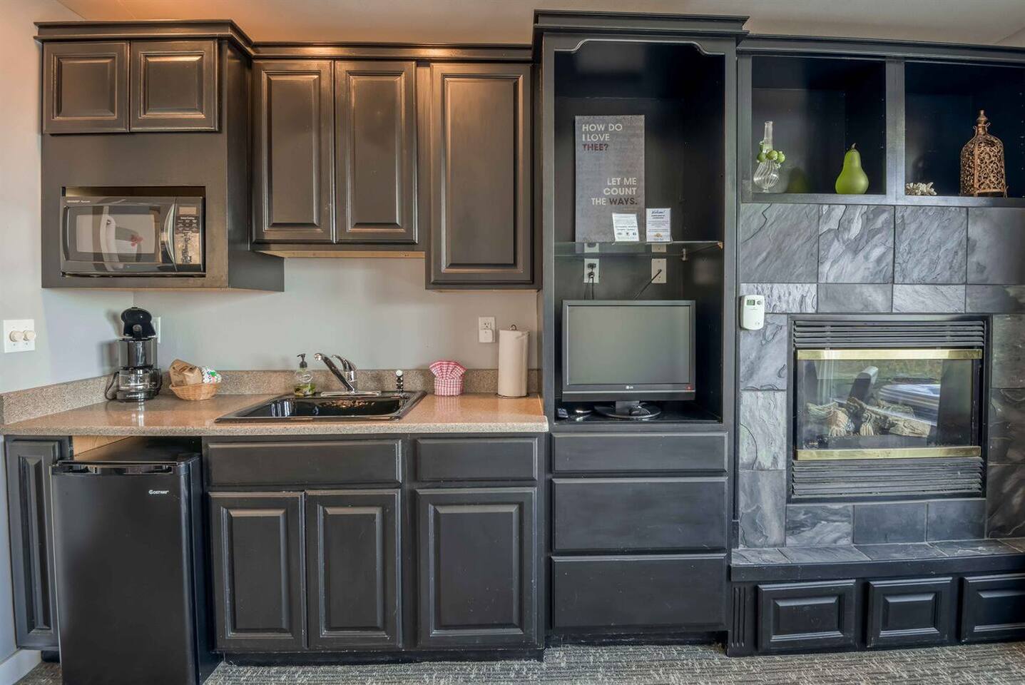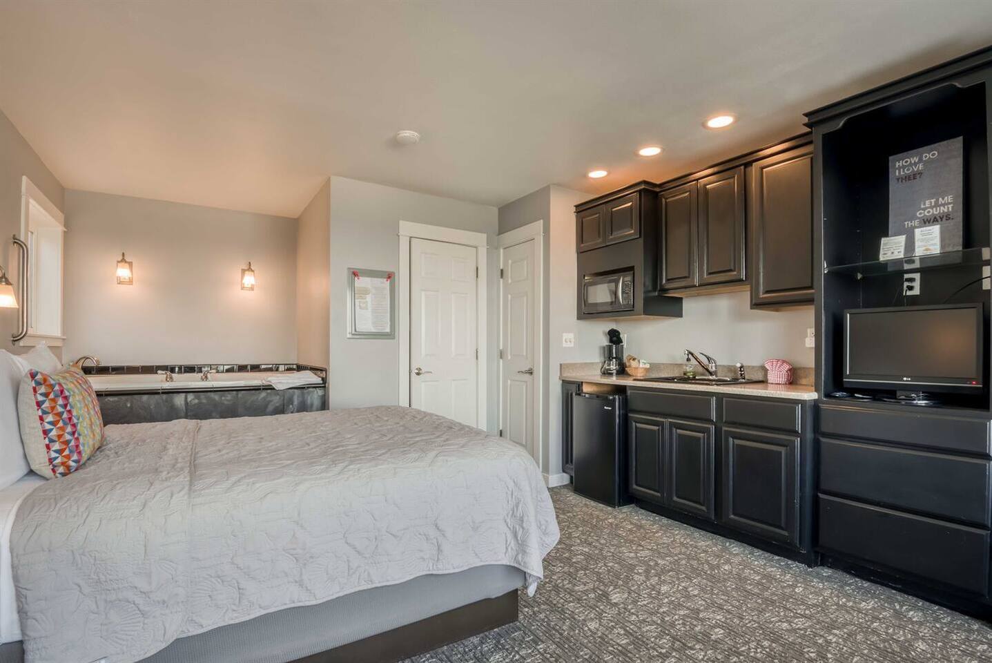 Studio style with king-size bed and 1 bath Oceanfront Hot Tub (exclusively yours, but entirely private) 2-person inside whirlpool tub with ocean view Custom slate gas fireplace Kitchenette with granite counter-tops, mini-fridge, microwave, coffee-maker Cable TV 2-headed shower Luxury linens & robes