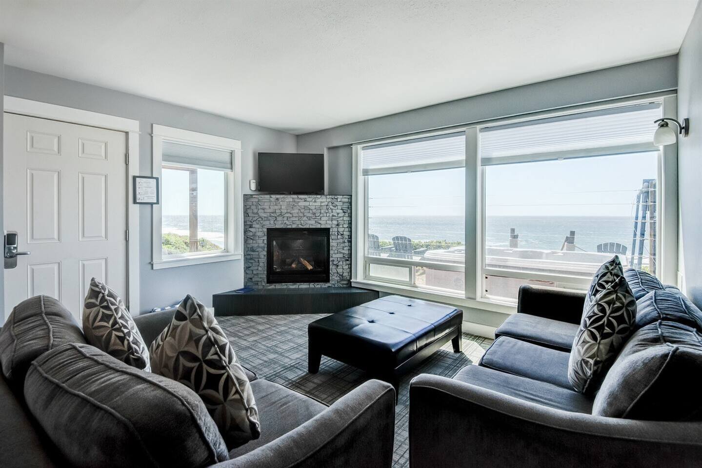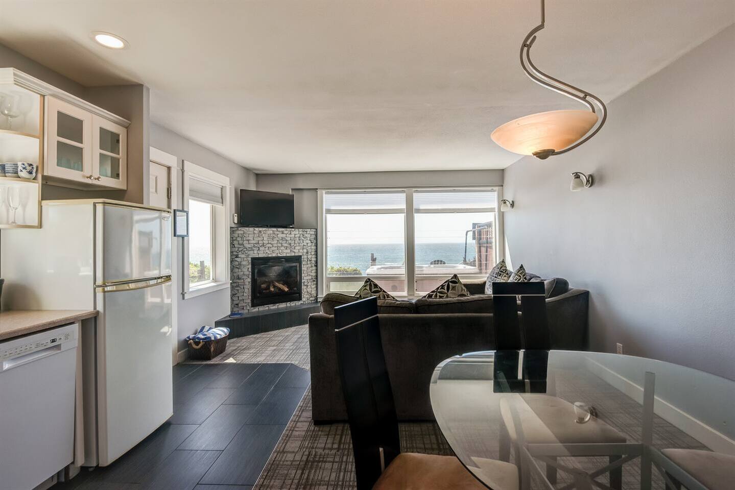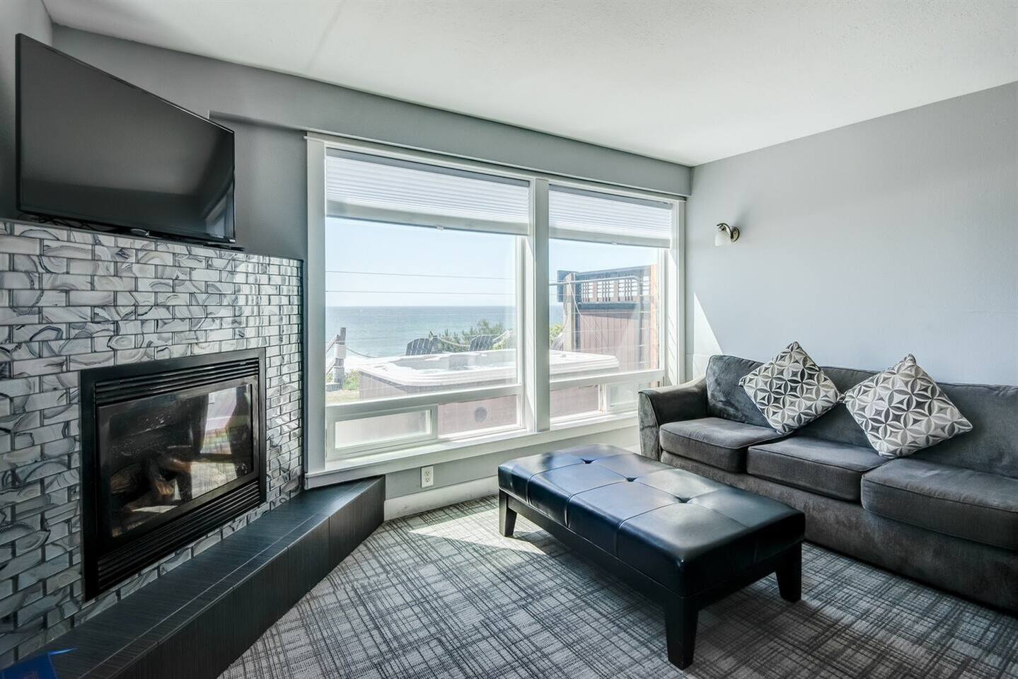 Experience ocean views and simple beach elegance in this oceanfront suite. Miles of beach views, waves & sunsets. View the stars from your oceanfront hot tub. 2 bedrooms and 1 bathroom (4 persons max). Living room with gas fireplace with custom tile. Large and luxurious jetted soaker tub & 2-headed shower. Kitchenette. with granite countertops To ensure the serene atmosphere our adult guests expect, we welcome individuals 18 years older. Access requires two sets of stairs.